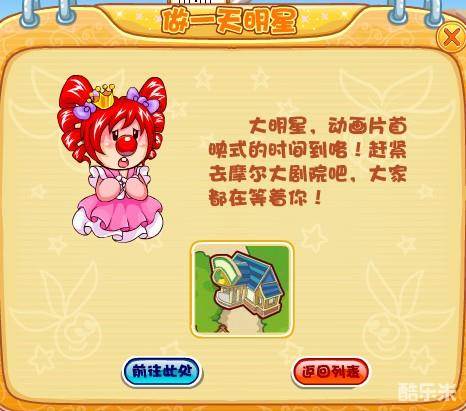 庄园全新的动画片即将在摩尔大剧院开播咯!据说么么公主想在庄园里挑选一个小摩尔来做首映仪式上的大明星,快去城堡门口找粒粒打听一下吧!完成任务可以获得:2瓶延寿药剂和2000摩尔豆哦!
