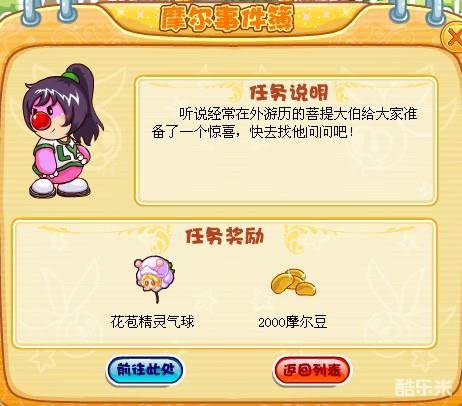 听说经常在外游历的菩提大伯给大家准备了一个惊喜,快去找粒粒问问吧!完成任务可以获得花苞精灵气球和2000摩尔豆哦!