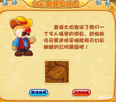 菩提大伯告诉我们一个令人振奋的消息,赶快前往云雾迷桥采摘能吸引幻彩蝴蝶的红斑蘑菇吧。