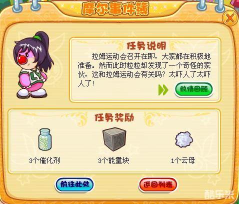 拉姆运动会即将召开,大家都在积极的猪呢比,然而此时粒粒却发现了一个奇怪的家伙,这和拉姆运动会有关吗?完成任务可以获得:3个催化剂,3个能量块和一个云母。