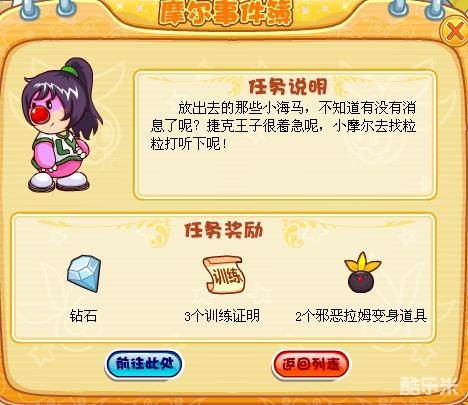 摩尔庄园中放出去的小海马不知道有没有消息了呢?赶紧去找粒粒打听打听吧。完成任务还能获得:钻石、3个训练证明和2个邪恶拉姆变身道具哦。
