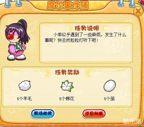 小乖似乎遇到了什么麻烦哦,赶紧找粒粒去问问吧。完成任务将获得:5个羊毛、5个棉花和5个茧。