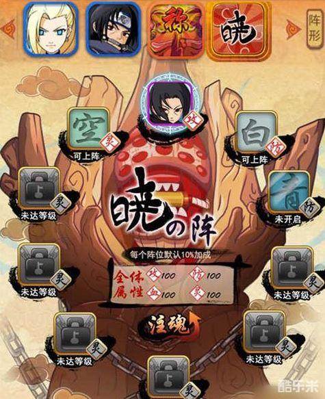 1、晓の阵有十个位置,忍者放在对应位置上即可按位置属性加成,又可让阵内所有忍者加缘。