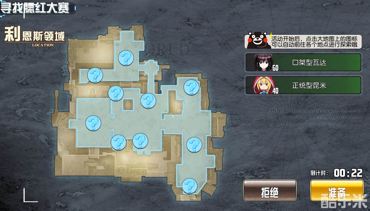 酷MA萌大人在视察中因为吃到了超级好吃的英式司康饼,不小心把腮红遗失了。亚瑟们需要集结队伍之后到各个可能藏有腮红的地点探索,途中会遇到各种挑战,亚瑟们要注意安全!不得不让人怀疑酷MA萌大人是故意把腮红藏起来,为的就是锻炼亚瑟们的探索能力。
