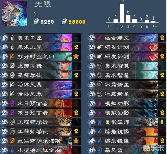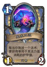 1费1/2元素,作为元素卡,他能帮法术红宝石升级贡献一点价值,而更大价值,就是他是这套牌苟活的一个关键,因为没有带DK,所以吸血什么不存在的,唯一依靠的就是护甲,除了随机法术可能给的冰甲以外,剩下的,也是最稳定的,就是奥术工匠和解场法术配合提供的护甲,能为我们争取时间。但很多时候都是非常险的,这套牌血线的刺激程度不比当年的手牌术差。
