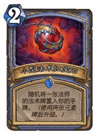 一方面亡语可以为我们提供套牌外的法术,加快任务进度,另一方面他作为元素,可以为小型法术红宝石提供升级的经验,而且本身是一张2费卡,入场很简单,一血随从,死亡很容易,即便对手不解,我们一个火冲也能得到亡语的随机法术,做任务稳定性极高。