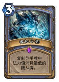 3费复制手牌中消耗最低的随从牌,也许有的小伙伴会奇怪,我们无限火球法不是只要4个学徒吗,带了2个,熔岩镜像2个,模拟幻影2个,完全溢出了啊,算数量是没错,但是满编也是逼不得已,一方面更多的造学徒手段,那么就可以让我们更早打出无限火球法斩杀,另一方面也是为了防止爆牌、销毁牌、以及抢牌,遇到这些情况,如果刚刚好只有4个学徒,并且随机法术不给力,没有提供复制手段,那岂不是功亏一篑?
