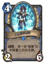 4费2/6,站场能力还是不赖的,而且可以给我们补一张镜像牌,这张镜像牌用途很多,除了是套牌外的卡,可以加快任务进度以外,他还有不错的抵抗能力,最少抵抗2个攻击频率,变相为英雄回复血量,而且作为一张法术,同样可以作为无线火球的引擎!