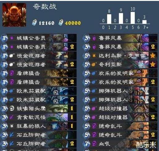九个职业都在秀,只有战士在挨揍,叠最厚的甲,挨最毒的打。我们的战士从来都是这么头铁,奇数战也秉承了这一优秀传统,抗揍能力一流,这多亏了砰砰计划中的新卡欢乐的发明家和奇利亚斯,能够为很大程度吸引火力并回血,简直是抗压神奇,值得一提的是战士的新武器超级对撞器,本来在版本初期,大家都普遍认为这又是一张逗比卡,没想到实战效果如此爆炸,比盗贼的背叛还要好用。
