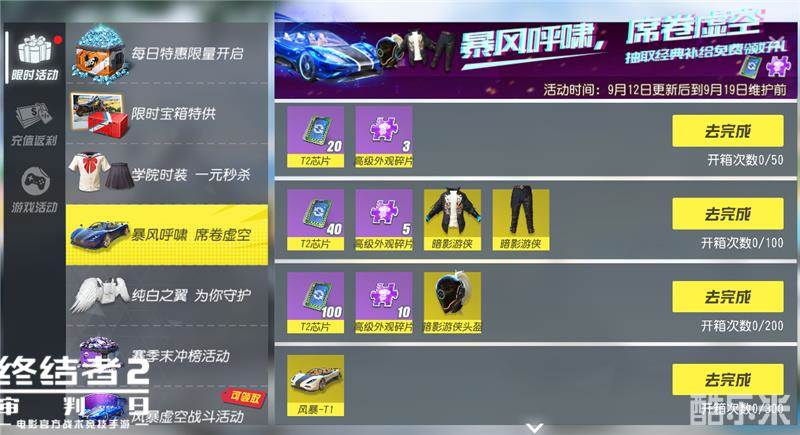 暴风呼啸,席卷虚空活动,开箱抽取经典补给即可额外领取T2芯片、高级外观碎片、暗影游侠时装和风暴-T1皮肤等奖励!