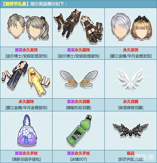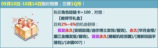 9月10日-10月14日,购买角色经验卡+100,附赠【教师节礼盒】,有机会获得:首发永久【安妮助理发饰/迪尔博士发饰/服饰】、永久【华月金橙发型/墨江金穗发型/服饰】、极品【蜻蜓机轮羽翼】/【清新田园手提包】/【冰镇007】或其他奖励之一!其中核心极品期限型概率范围为:4%-6%,核心奖励永久型概率范围为:2%-4%,非核心奖励概率范围为:90%-94%。