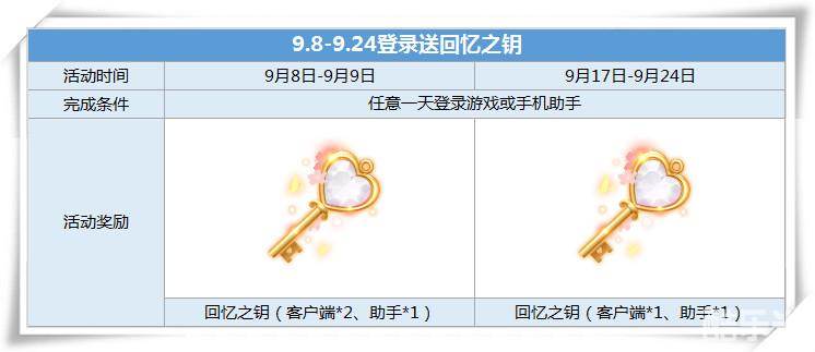 9.8-9.9 登录游戏即领2个回忆之钥,登录手机助手额外领取1个回忆之钥,9.17-9.24登录游戏,再领1个回忆之钥,登录手机助手额外领取1个回忆之钥!