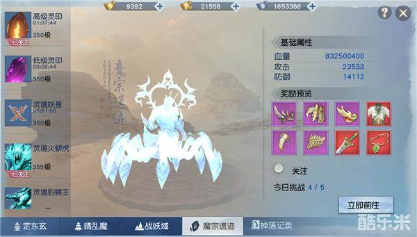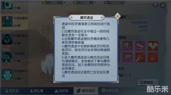 魔宗遗迹,其实可以看成是一个自由夺宝的地图,道友需要达到350级才可单人参加。在地图内,存在着宝物(灵印)、怪物(灵境妖兽)、各种强大的boss,道友身在其中,采集灵印、击败怪物和boss,都可以得到丰富的奖励。由于击败BOSS有次数限制,对战BOSS的等级选择尤为重要。于此同时,只要道友在地图中的非安全区内存活,就可以源源不断的获取经验值奖励(无论道友在做什么都可以获得,挂机也是一样)。
