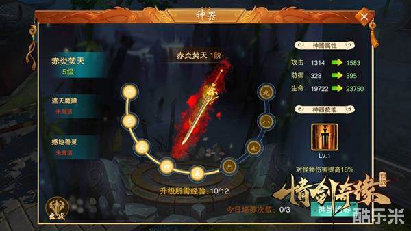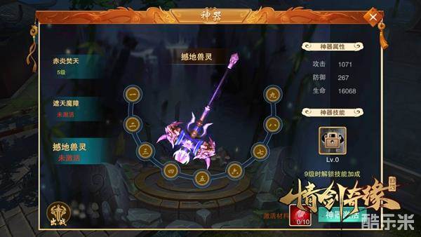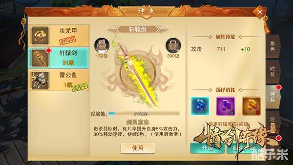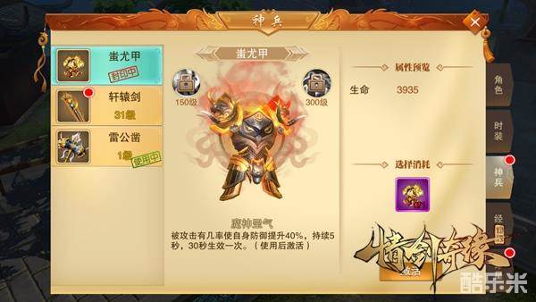 不同于法宝,《情剑奇缘》神兵无需收集,玩家开局即可获赠一件极品蚩尤甲!所有神兵均附带一个概率触发的被动技能以及暴伤等基础属性,随着神兵的升级,所附带的基础属性会飞速提升,达到一定等级更可解锁