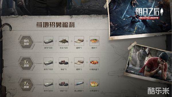 一旦在预约站中成功建立营地,且公测后进入该营地的市长和成员,将收获三重丰富奖励——预约奖励、3人奖励、7人奖励,奖励可叠加领取。新币、铁矿、药品、食物,带上你的必需生存物资,踏上明日末世之旅!