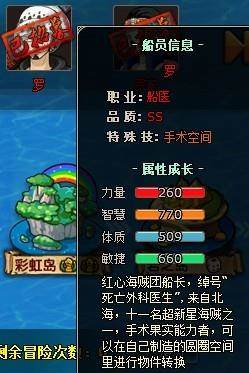 罗的属性成长~标准的船医属性~比较水桶~相比乔巴有更高的力量~物防会高一些~相对的血量少了不少~敏捷比女帝还要高30~唯一美中不足的就是智力偏低~罗的技能还是很需要高智力支持的~