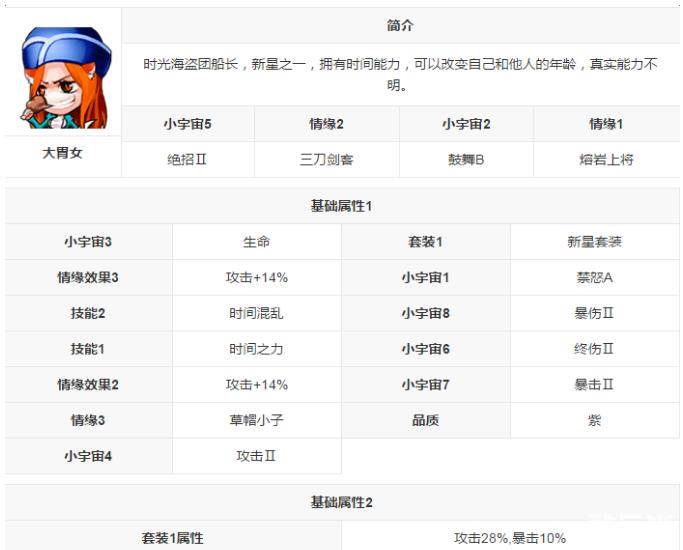 时光海盗团船长大胃女,也是新星之一,拥有时间能力,可以改变自己和他人的年龄,真实能力不明,属性上有什么特点呢,下面不妨详细了解一下吧。