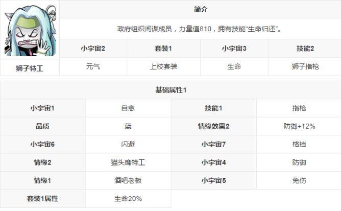 狮子特工是政府组织间谍成员,力量值810,拥有技能“生命归还”,属性好不好呢,下面不妨详细了解一下吧。