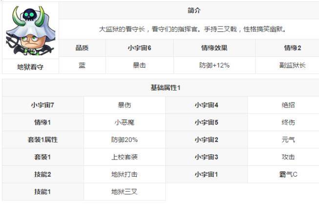 地狱看守是大监狱的看守长,看守们的指挥官。手持三叉戟,性格搞笑幽默,属性上有什么亮点呢,下面不妨详细了解一下吧。