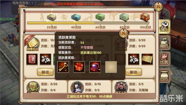 刷江湖日常到60活跃和100活跃,会分别得到一颗加25体力的大体力丹,所以每天的活跃一定要刷满。另外在刷活跃度的同时能够翻牌,有几率获得一些小体力丹,也能回复一点体力。活跃度刷满需要完成不少的玩法内容,根据自身的情况做选择。