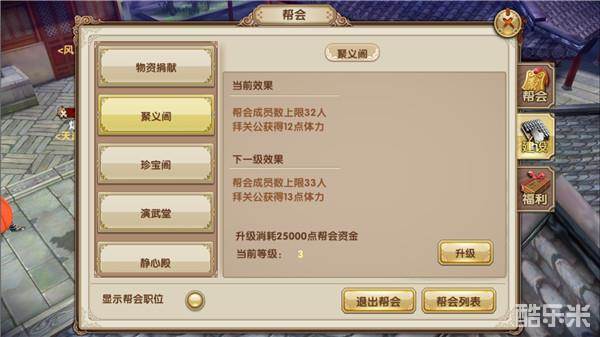 加入帮会可以每天拜关公获取体力,体力的多少与帮会的等级相关,帮派等级越高,聚义阁等级越高,可以领取的体力越多。