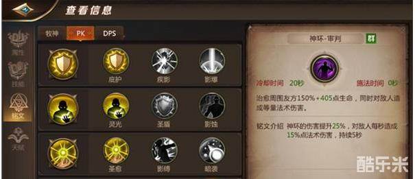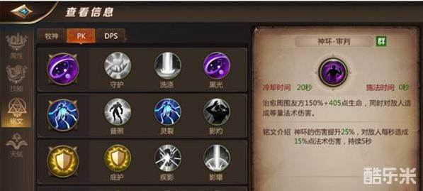 神环-审判:治愈队友,并对周围敌人造成持续伤害(持续5秒),牧师很多时候自己不用动,敌人的刺客、战士等职业就会自动来到牧师面前,牧师不用担心神环-审判打不到人。