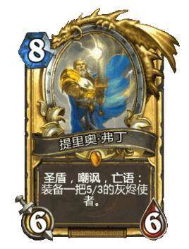 佛丁也是属于经典的超模卡牌,66圣盾嘲讽再附上一把5/3的刀,那么问题来了,黑骑士砍弗丁亏不亏呢?这张卡唯一惧怕的恐怕只有沉默了。佛丁这张8费卡有15费的效果。
