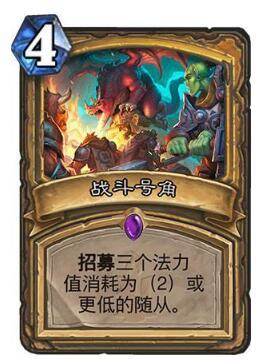 曾经快攻骑士肆虐天梯的资本,战斗号角4费法术,效果为从你的牌库中召唤3个2费和2费以下的随从,同样的,我们对比一下同为召唤3个随从的法术,德鲁伊的自然之力,5费召唤3个2/2随从,战斗号角完胜,但是最重要的是,战斗号角对于过牌能力偏弱的骑士来说,不仅解决了过牌能力,(等于用1张牌打出了3张牌的作用)还大大压缩了牌库,需知这样就极大的规避了,后面每回合抽一张牌的鬼抽风险。