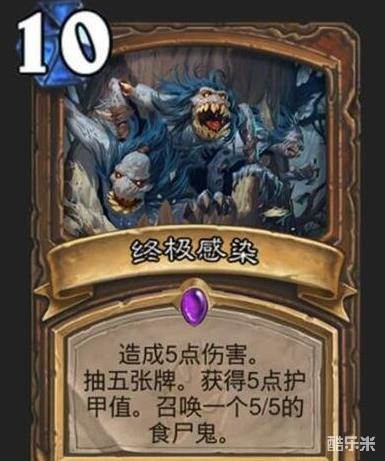 10费打5召唤55获得5点甲还抽5张牌,算上卡费11费,做到了22费的事,单从超模角度看,盾妹,655战吼加5护甲,星火术,6费打5过一张牌,疾跑,7费过四张牌。所以终极赖皮就相当于疾跑的盾妹给你一发星火术,这三张加起来19费,而终极赖皮只要10费。你以为这样就足够了吗?没有由于上面是三张卡赖皮只要一张,所以赖皮的实际费用还要再加,保守估计赖皮超模10费以上。结论就是终极感染是无脑强的!