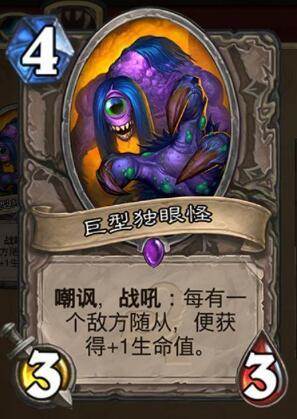 该卡出自上古之神的低语版本,巨型独眼怪的上限很高,设计初衷也是为了克制铺场型快攻卡组,尽管较少进入到当时的天梯中,但在竞技场发挥出色,对方场上三个随从就稳赚不亏,其实是一张不错的单卡。