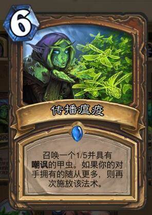 最后最重量级的克制铺场卡牌,肯定就是传播瘟疫无疑了,该卡也是从曾经的“一分卡”摇身一变,到如今在小德卡组中占据核心地位,记得刚上线的第一个平衡性补丁就被削弱增加了一费,还是那么受玩家们喜爱,对铺场型快攻来说传播赖皮就是他们的噩梦啊!有了该卡的保驾护航,也让小德各种花里胡哨的套路得以实现。