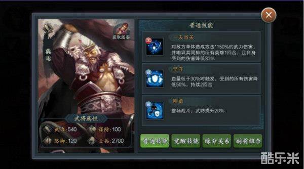 一夫当关的主动技能不仅可以对敌方造成150%的武力伤害,还可以嘲讽同排英雄一回合,并且自身可以获得30%的减伤,可谓是一箭三雕的技能啊。因此无论初期还是后期,典韦都是一个吃香的英雄。