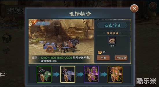 每天12:00-14:00和18:00-20:00期间护送军资,收益可以加成50%哦!