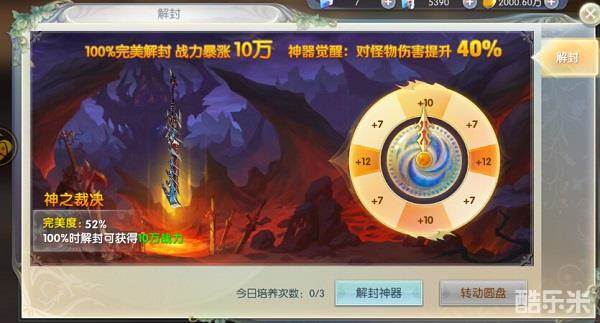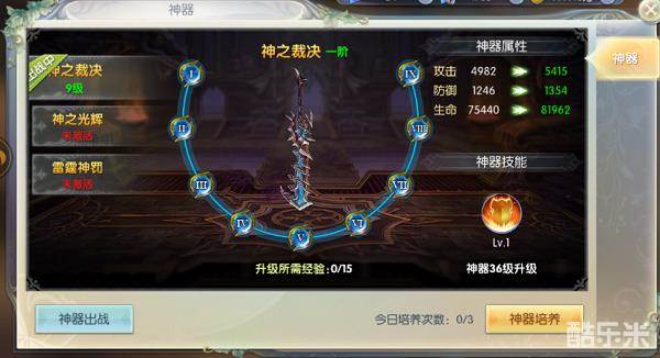 创世神曲神器系统是全新独一无二的系统,玩家达到一定的等级后就可以开启神器系统,每个玩家每天只可以转动三次免费的圆盘,通过转动圆盘的方式累计神器的完美度,转动次数无法通过任何方式增加次数,即使氪金也不行,需要的只是每天登陆转动转盘来提升神器。虽然完美度大于80%的时候还可以提前解封神器,但是提前解锁以后每天培养圣器的额度会下降哦,当完美度100%解封,战力能飙升十万,神器觉醒可对怪物的伤害提升40%!