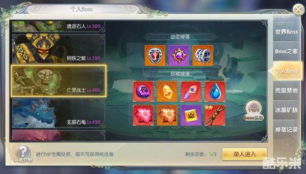 个人Boss的装备掉落可是比世界Boss好太多,必定会掉狗粮和材料宝箱,土豪的专属定制。有钱任性的朋友可以前去一探究竟。