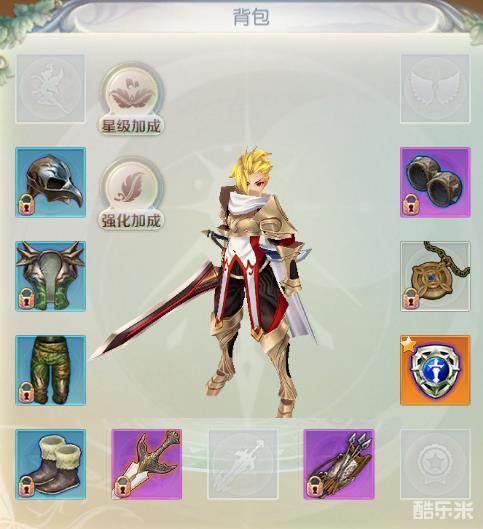 《创世神曲》里的装备由主手武器、副手武器、铠甲、头盔、护手、护腿、靴子、神迹·天劫、神之裁决、翅膀和神迹·徽章组成。