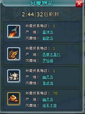 3 每个港口产出货物为1~3种,货物1无需贸易等级即可购买,货物2.3需要根据对应的货物等级才能购买。物价每半小时会刷新1次.