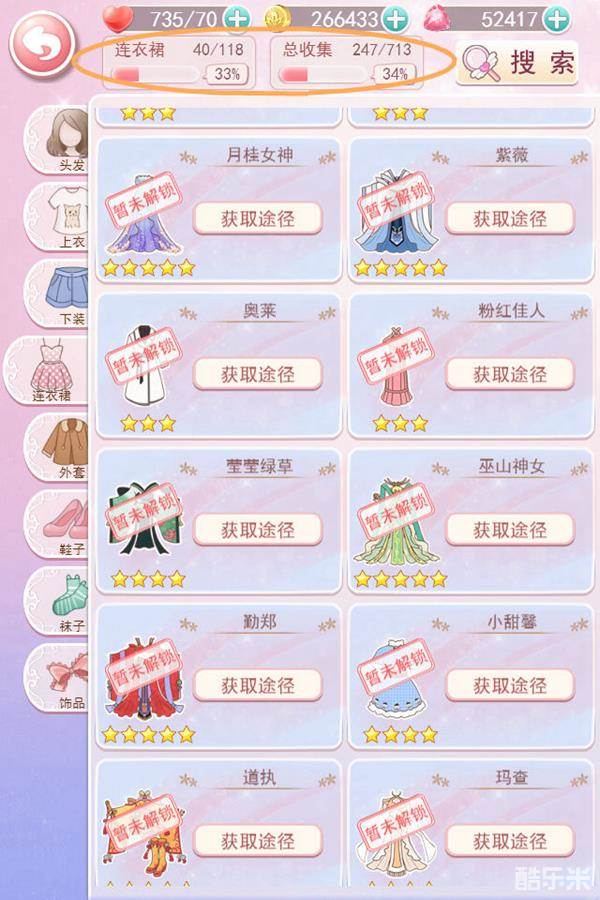 点击“衣橱”可以看到已拥有的服装,上方还可以看到这个类别的搜集的进度呢。