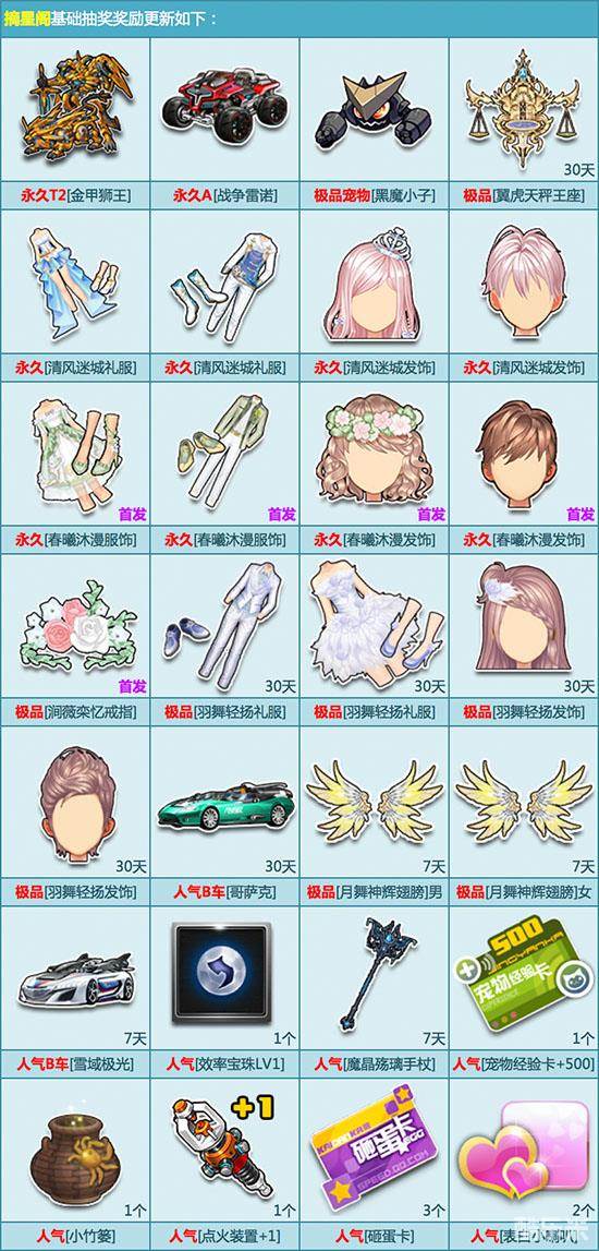 最后编辑于7年前11月11日-12月1日,【摘星阁】极品奖励更新,助你嗨翻暑期,永久S车【暗夜幽灵】、永久双人骑宠【齐天大圣】、永久A车【残月晓风】、永久座椅【水晶之梦座椅】等豪华奖励等你来拿,千万不要错过!