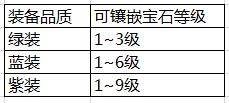 低等级的宝石可以可以镶嵌在高品质的装备上,但是高等级的宝石只能镶嵌在高品质装备上。如表,1级宝石可以镶嵌在任意品质装备上,但是9级宝石只能镶嵌在紫色品质装备上。