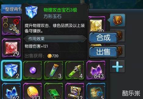 玩家可以通过背包中的“宝石”快速查看自己持有的宝石,宝石可以出售以获得金币。低级宝石可以通过合成功能合成为高级宝石。合成需要消耗3个同类型宝石和蓝色精华等材料。