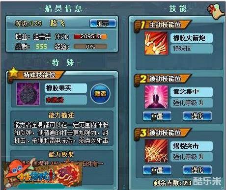 船员路飞:职业为狙击手,品质为SSS级,主动技能“橡胶火箭炮”可对单体目标发动三档攻击。