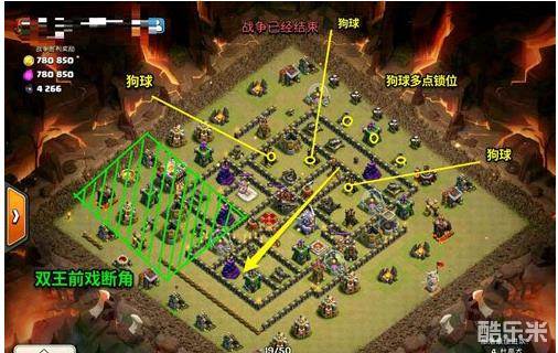 这个阵型的漏洞,在于11点位置的小区域城墙都在女王的有效射程范围内,从而节约了前戏的误差。(如开墙细节)双王的前戏,将绿色方块打断后,狗球的路线就十分明显。