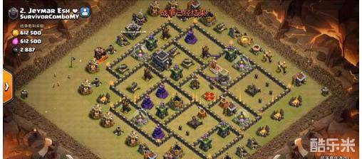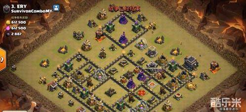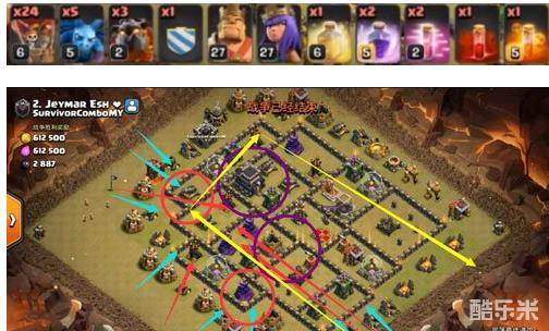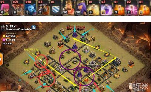 此阵四个火箭略靠边,很容易判断出如果从9点下方选择第一组狗球进攻,则按照顺序狗球从9点绕向6点,再到3点。按照逆时针方向可以分别击破四个火箭,气球换绕一圈最终汇聚到12点完成三星。由于上方12点较多箭塔和法师塔汇聚,开场前我尝试用多个气球点掉上方的大量对空建筑,但由于操作节奏过慢所以没有成功。不够最后气球依旧从9点逆时针环绕至12点拿下三星。