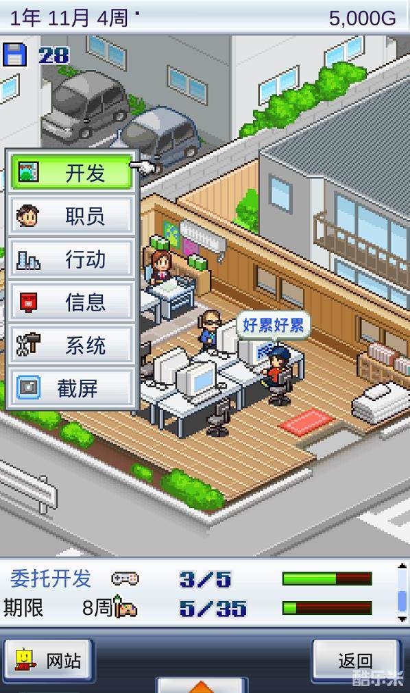 游戏菜单栏:点击菜单后显示,主要包含开发,职员,行动,信息,系统,截屏6部分系统内容。