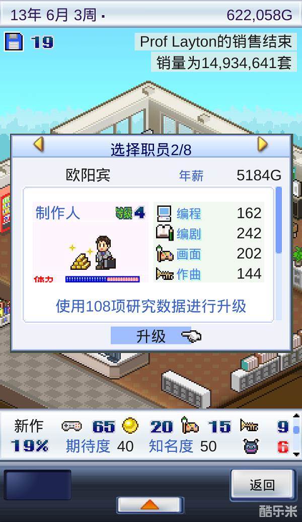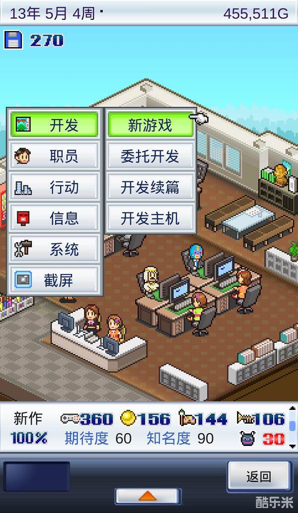 6.1.1新游戏:游戏中的新游戏玩法很好的模拟了一款新游戏产品从立项到诞生的整个研发过程。选完题材之后会进行游戏方案的制作。游戏有四个阶段:写策划案—设计原画—制作音乐—修改漏洞。当一款作品完成后就可以进行发售。