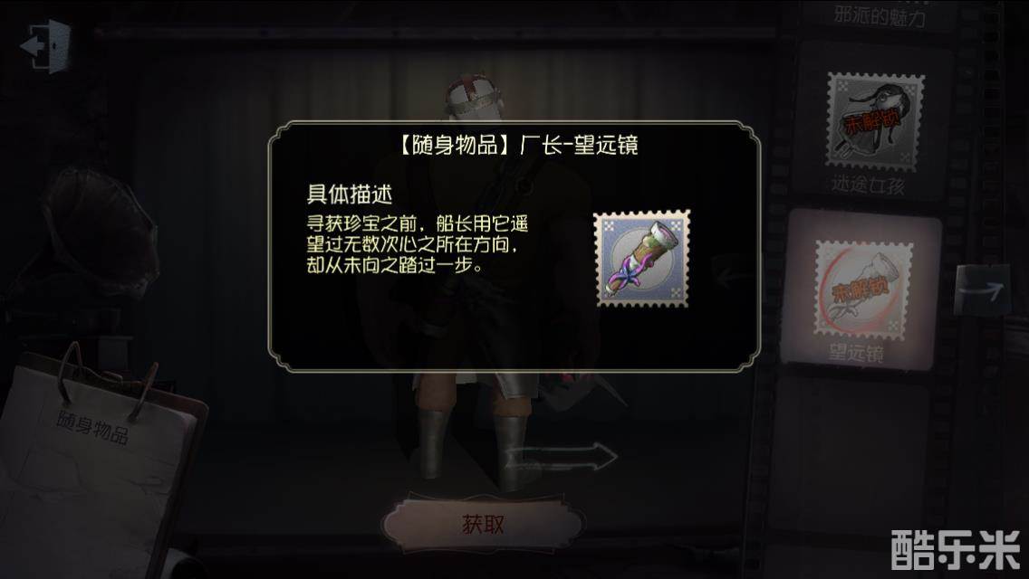 《第五人格》中除了时装可以给人物加色之外,还有随身物品可以给角色当挂件,虽然也不加成属性,但非常好看,这里带来是随身物品——望远镜,希望可以帮助到大家。