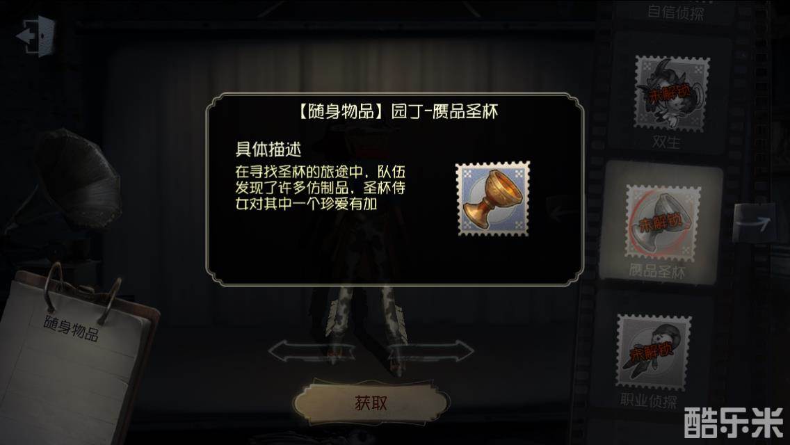 《第五人格》中除了时装可以给人物加色之外,还有随身物品可以给角色当挂件,虽然也不加成属性,但非常好看,这里带来是随身物品——赝品圣杯,希望可以帮助到大家。
