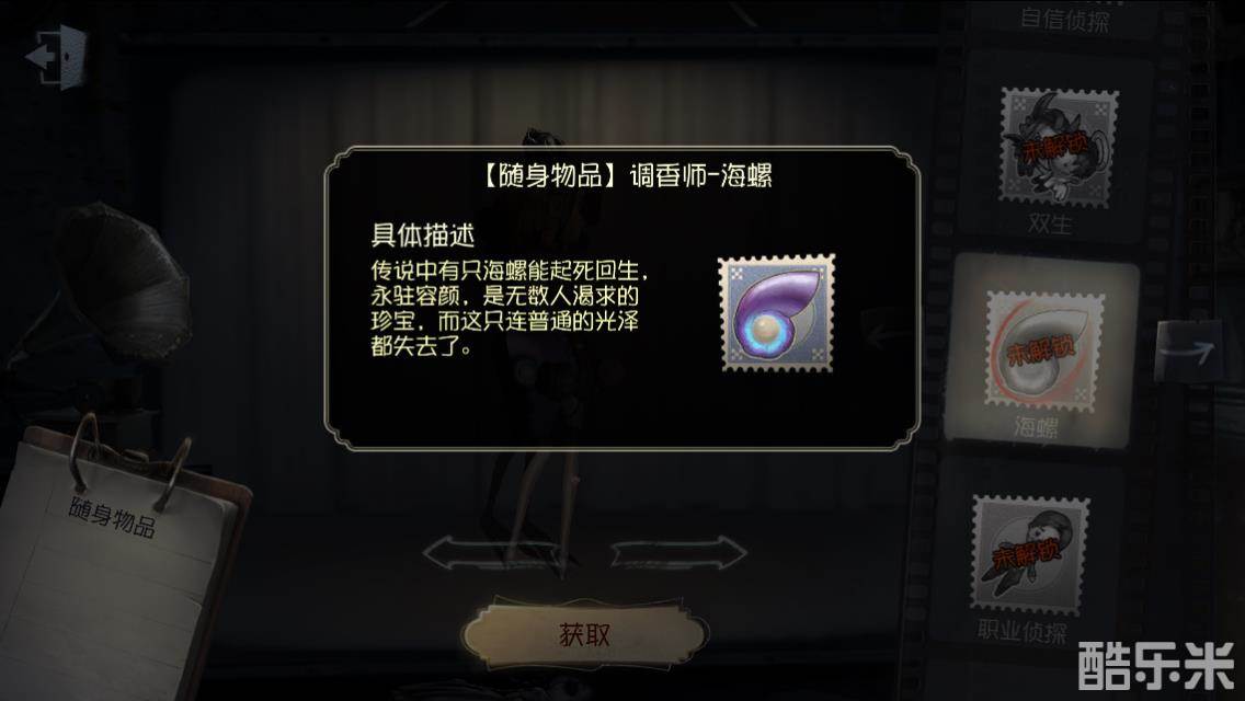 《第五人格》中除了时装可以给人物加色之外,还有随身物品可以给角色当挂件,虽然也不加成属性,但非常好看,这里带来是随身物品——海螺,希望可以帮助到大家。