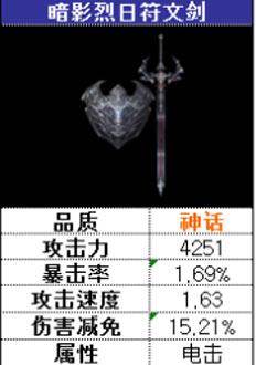 Raven掠夺者神话暗影烈日符文剑介绍,神话级别的武器属性不用我多介绍,你们单看属性图就能明白了,他们的伤害减免可以说是他们最大的财富,而我们在实战中一定需要将这个特点发挥出来哦。